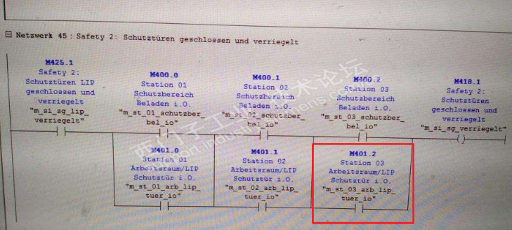 维修到现场后,注意到每次报警都是 Gantry到第一台机床抓件时产生保护回路闭锁的报警,看来问题就出自这台机床,而这台机床本身运行正常没有报警,在Gantry报警时查看电柜的AS-i gateway上面只是显示X.3 not active,当时德国老外也在现场,看了看后用自己的电脑连接PLC,看了程序,微微一笑,说了听不懂的德语,又对我说follow me,我拍下了程序,红框标的点当时没有接通。