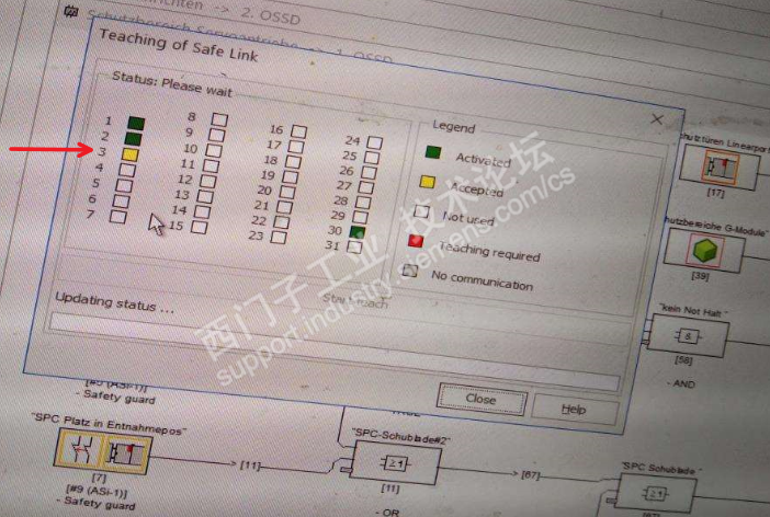 我们又到了电柜旁边,老外指着AS-i gateway上面显示的X.3 not active说“X”指的是interface。“.3”指的是第三台机床,也就说是第三台机床和Gantry失去了连接,之后他又打开AS-i monitor软件,连接后看到了下图: