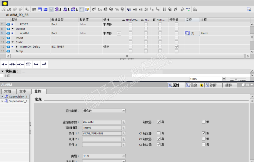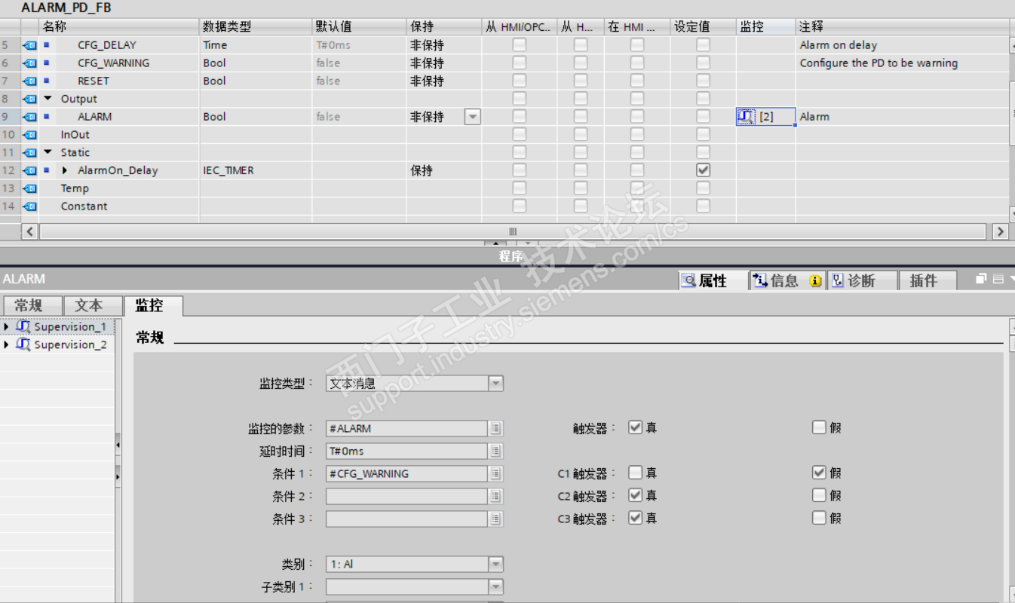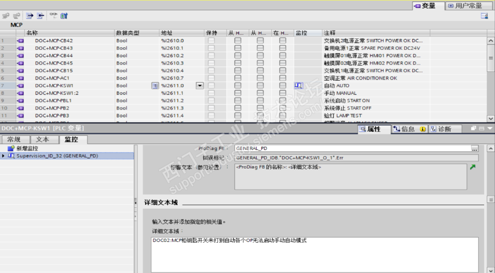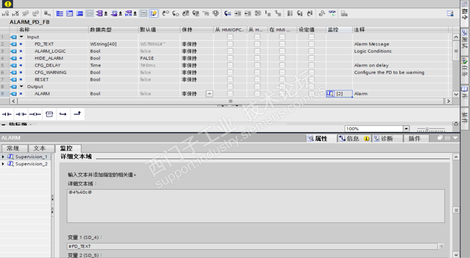 Progiag报警ALARM不能翻译PD_TEXT字符串, 监控类型可以由 “操作数” 更改为 “文本消息”,不在使用PD_TEXT的字符串,改用ALARM的注释文本.
