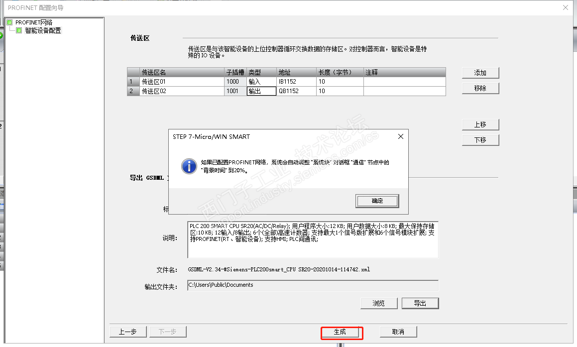 1.4点击生成,组态配置就完成了。这里会提示“系统块”对话框“通信”节点中的“背景时间”将为20%。