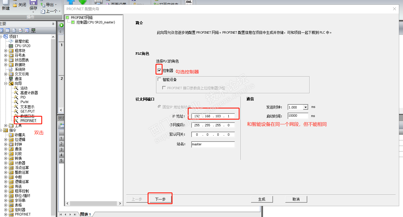 2.4 利用Profinet向导组态,配置Profinet控制器。