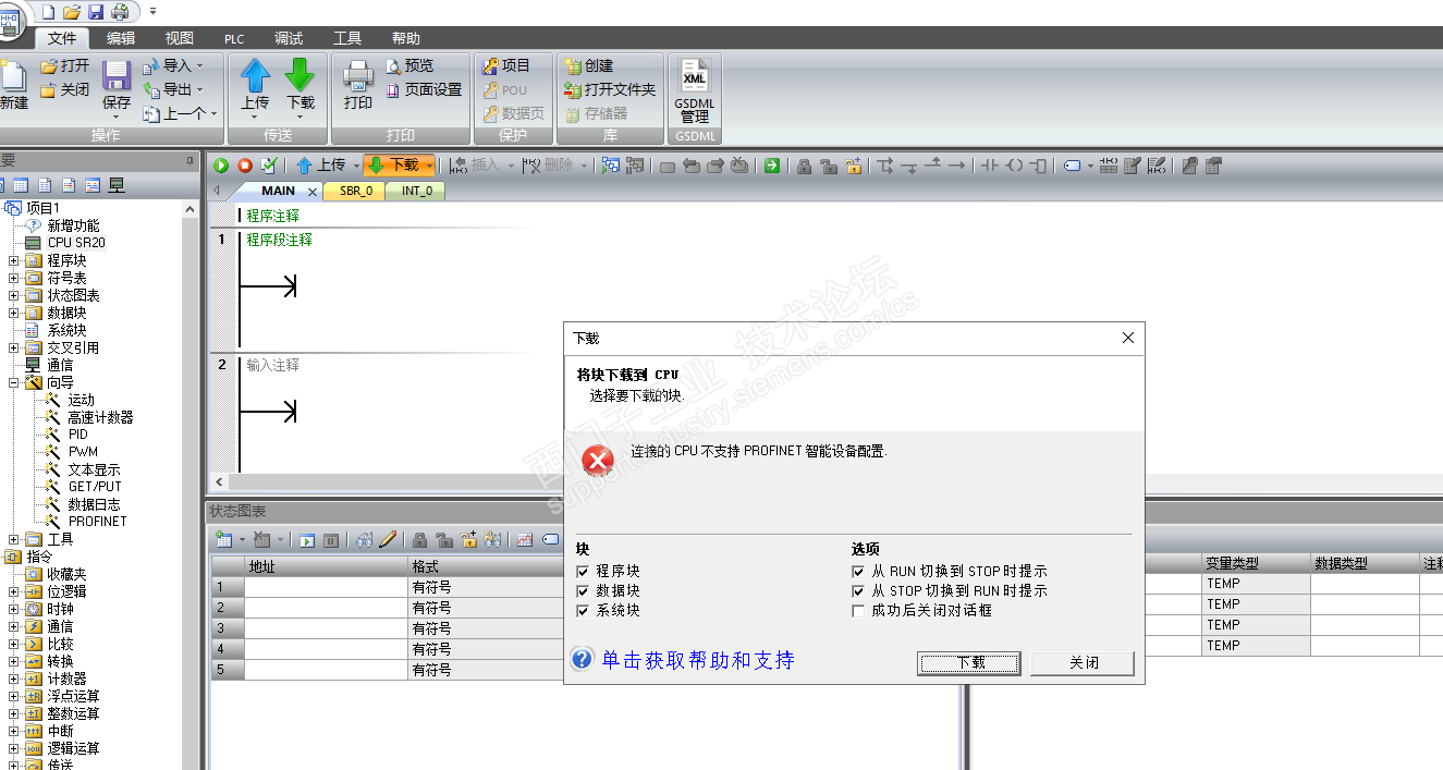 在配置完“智能设备”,下载工程时出现了“连接的CPU不支持profinet智能设备配置”