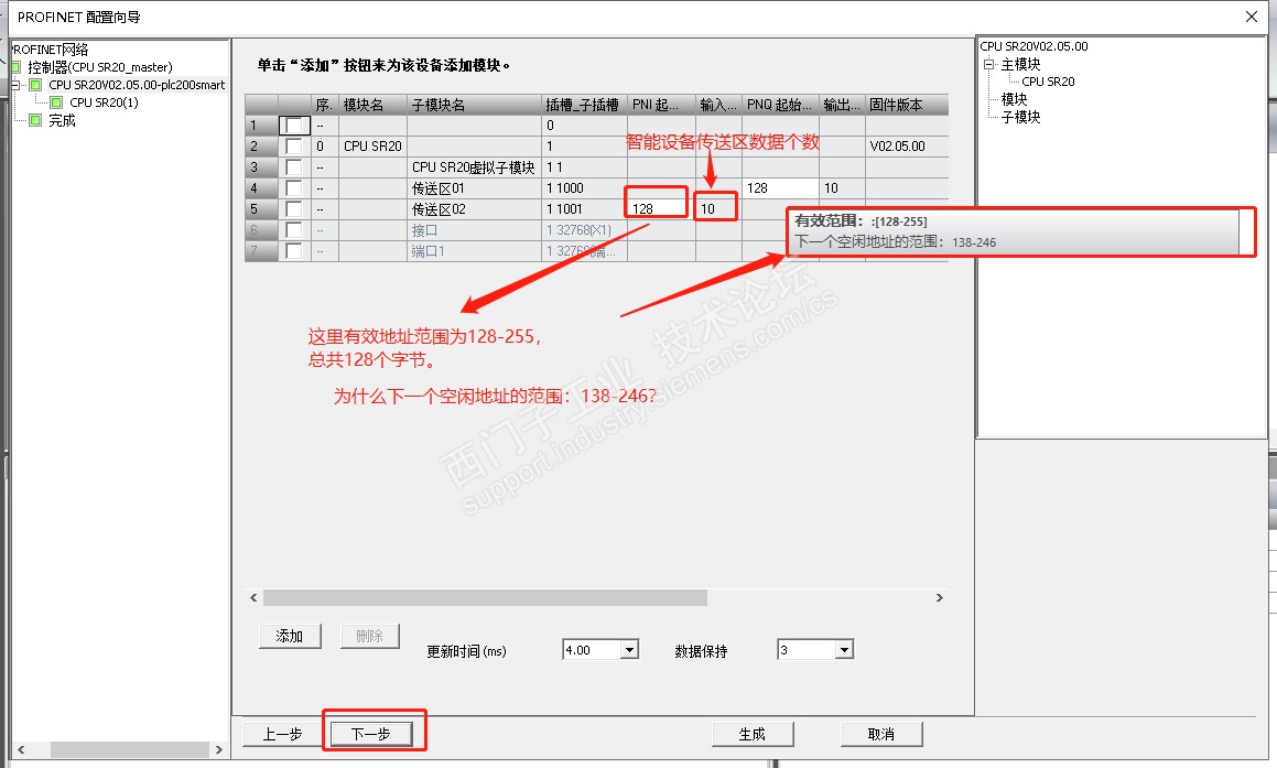 将配置好的PROFINET-IO拖拽到设备表中。点击下一步,因为在组态“智能设备”时已经将IP和传送数据长度配置好了,所以这里直接拖拽过来就可以了。