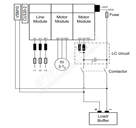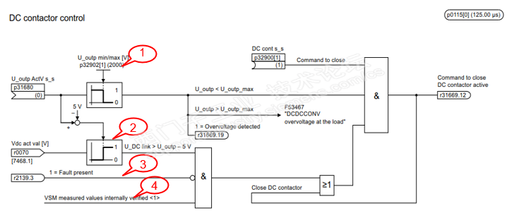 电机模块输出侧直流接触器将储能装置与驱动系统分离,通过TM31端子端模块或者控制单元数字量输出端子进行控制。当储能装置出现过电压时(即输出电压大于p32902[1]中设置的最大值),直流接触器打开。当①输出电压小于阈值,②U_DC link > U_outp – 5 V,③系统无故障,④VSM监测电压不能恒定时接触器闭合,控制逻辑如图2-5。