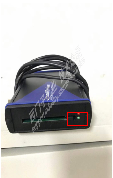 6)将程序卡插入下载器中,此时下载器会显示绿色,黑色的小按钮(位于绿灯的左边)也会弹出来,表示程序卡插到位;
