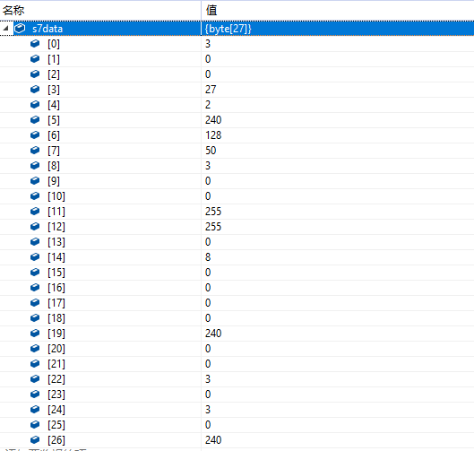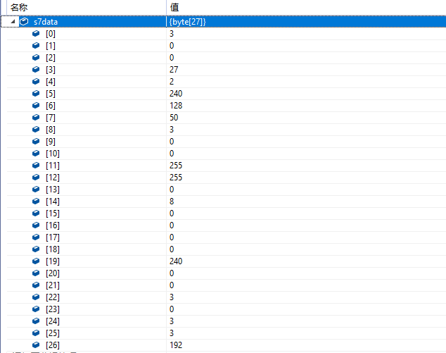 第二次握手返回的报文长度是27个字节,最后两个字节就是PDU的值,上图展示的是S7-1200PLC返回的报文,0和240的组合即为240。