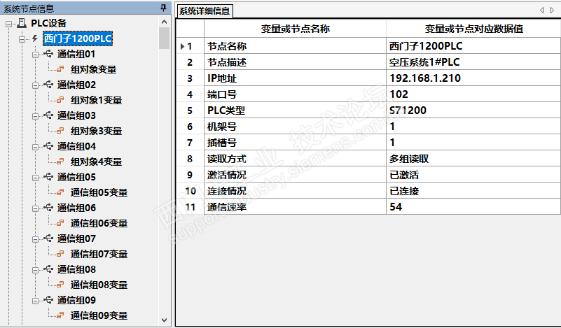 我们采用常用S7-1200PLC,基于CMS配置软件实现配置之后,开始通信测试,首先我们选择的是单组读取的方式,就是针对每个组,依次进行读取,结果如下,耗时大约200ms,这个时间应该相对来说还是比较正常的。