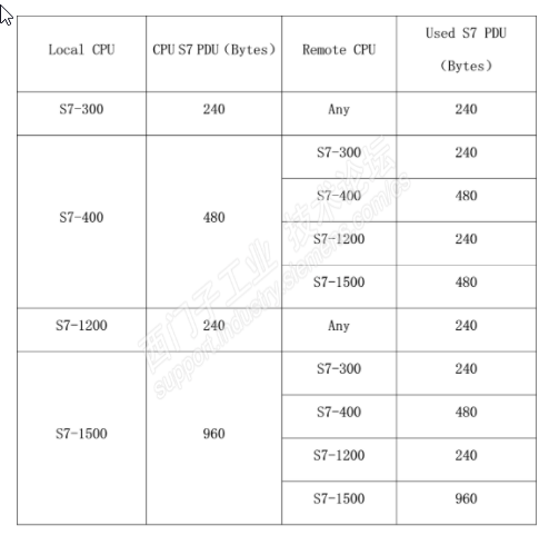 如下表,不同的CPU,S7 的PDU长度不同。而实际通讯协商过程中,通讯双方最终协商出的PDU 一定是以最小的一方为准。这样,知道了本地CPU 和远程CPU的类型就可以知道最终通讯使用的PDU 长度。