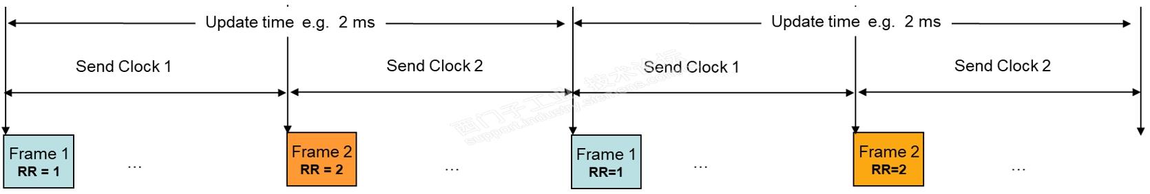先描述一下Send Clock,这个词中文翻译就是发送时钟,用来表示在一个发送时钟的时间间隔内提供RT/IRT数据的能力,或者说是发送RT/IRT数据的最小时间间隔,再者说是RT/IRT数据的出现本质上是在Send Clock时间内。说来说去,大家可能还是不理解,那么我们再结合Update Time,例子中为2ms,就是用户希望IO控制器与IO设备相互交换数据的循环周期时间。而2ms的Update Time实际上有2个Send Clock组成,这样Update Time=Send Clock x Reduction Ration (2ms=1msx2),2就是这个例子中的减速比。也许大家看过详细的PROFINET标准中关于这方面的计算,还有Sendclockfactor,Phase等其它概念,这些放在一起计算比较复杂且难以理解,这里我所描述的公式更便于大家理解。PROFINET的Send Clock就是发送RT数据的时间单位,为了优化带宽,RT数据会自动分布在多个Send Clock中,下图例子中使用了2个IO设备,Send Clock为1ms,Update Time都是2ms。图中是优化的结果,两个IO设备的刷新时间都是2ms,而不是Frame1和Frame2都出现在Send Clock1中。