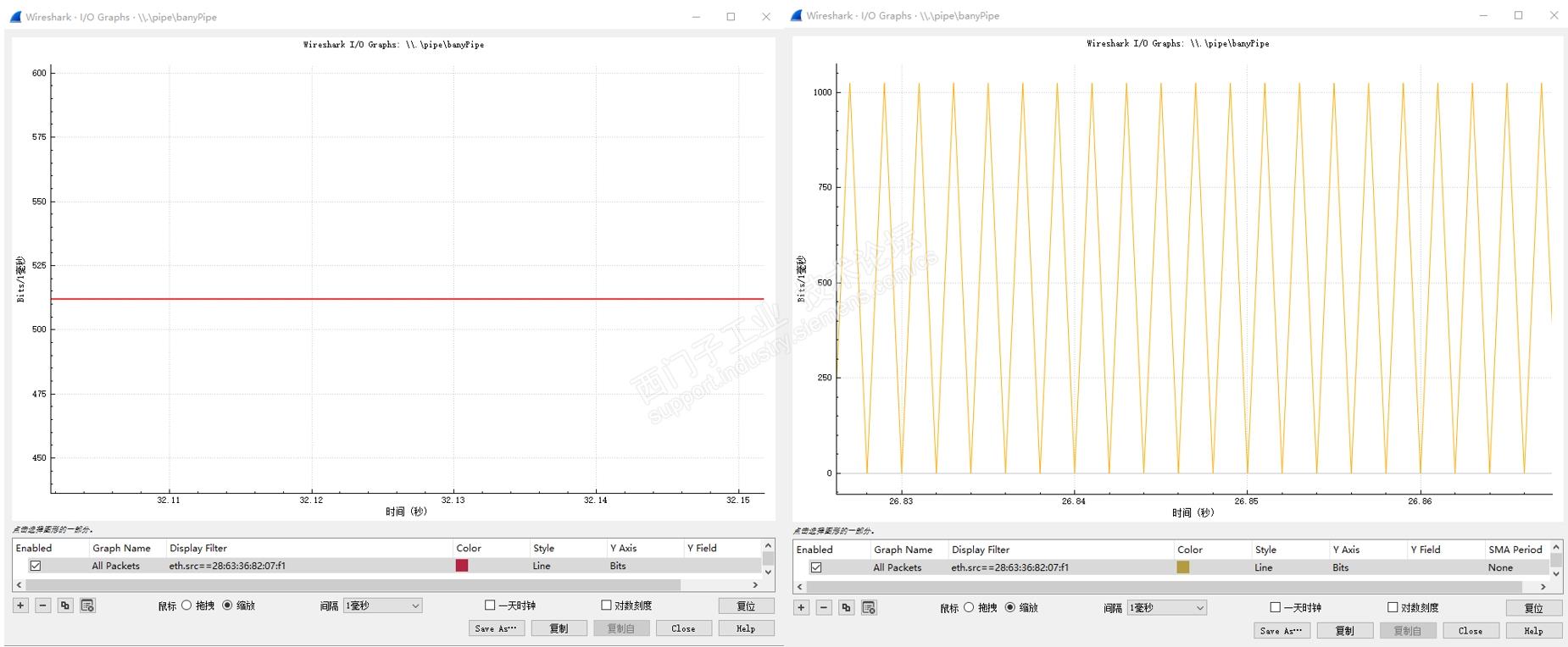 大家可能还是不能有感性的认知。结合上图给大家展示一个实验的结果,使用S7-1500作为IO控制器,(其它PLC也可以),使用两台ET200SP,在IO控制器侧设置Send Clock为1ms,IO设备侧设置的刷新时间为2ms,那么可见下图左侧的实时数据的带宽。如果在IO控制器侧设置Send Clock为2ms,IO设备侧的刷新时间仍为2ms,那么可见下图右侧的实时数据的带宽。由此一目了然!