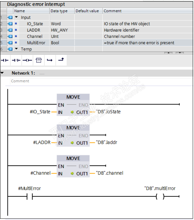 6. 为每一个“MOVE”指令的输入参数设置为OB82诊断中断块接口参数((“IO_State”, “LADDR”和 “Channel”)中的一个。