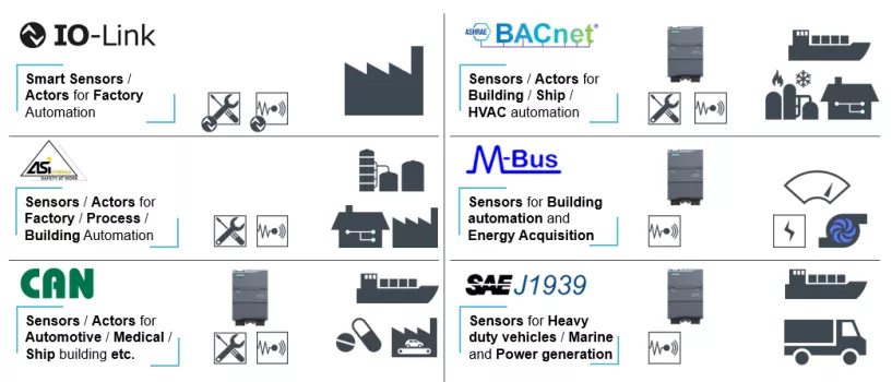 在现场层级,除了众所周知的PROFINET和PROFIBUS协议之外,还存在一些其他现场总线系统,这些总线系统有些对于S7 PLC控制器是直接支持,有些需要使用西门子产品组合的不同网关产品支持。