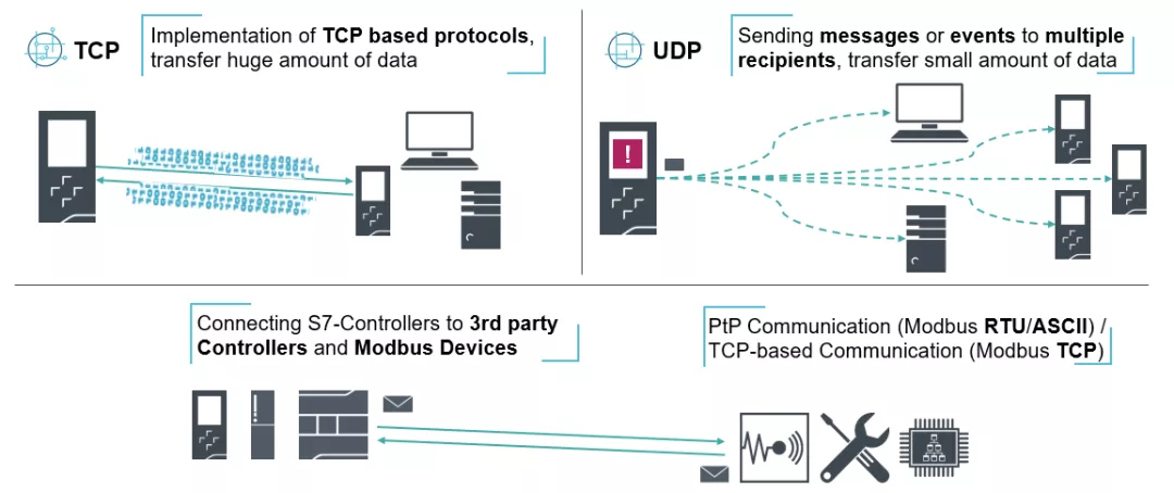 所有这些协议均可以默认在S7控制器中实现,并且可以与TIA博途中的功能块一起使用。