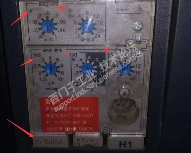 一台西门子壳式断路器VL630容量630A给一台200KW的电机提供电源,已经运行了2年多,突然开始出现电机启动时容易跳闸的故障。检查电机主电缆接线端子紧固、电机轴承加润滑脂、检查液压压力、检查接触器的触点,电机启动瞬间电流大,用钳形表测量启动电流超过1000A,将断路器三个调节旋钮都调大一级,仍然没能解决跳闸的问题,延长星角转换的时间,转换时间由8s延长到12s、15s等仍报跳闸,超过15s会出现1号主泵断路器故障,实际断路器没有跳闸,检查主泵PLC控制,超多15s星角转换没有结束,会输出启动错误报警。看来是时候补补西门子壳式断路器的In、Ir、tr、Isd、tsd、Ii等可调节电位器的功能啦!