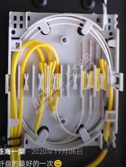 请外协师傅开干的时候我在边上一边打下手,一边也认真观看,看他们手法娴熟好像很简单的样子,觉得我也能试试。当真的有一天老板把新机器邮到我身边时还是有点手足无措的,真是一看就会,一干就废,真应了抖音上的段子:大脑问眼睛你看会了吗?眼睛回答:看会了。手对着眼睛质问到:你放屁。动起手实操起来总觉得这些材料工具都通通不听话不友好了,他们在以前那些外协师傅手里怎么这么乖呢?不过随着N次的失败不断总结剥纤,清洁纤,割纤等要领,终于熔成功了一对,那个开心啊,开心不到5秒,没套热缩管,得!从新来过。就这样不断折腾终于可以熔10次,一次性成功有七八次了。要求也不能太高,想比肩专业干网络熔纤的师傅这辈子是不奢望了。干的次数多了后也体会出最麻烦的就是固定热缩管和盘纤了,真是熔的好不如盘的好。从师傅们处看到的固定用胶布我也用胶布,但是就是粘不牢,粘吧粘不住,不粘吧不踏实,用胶布到底是为固定还是为挡光到现在也没搞清楚,有一次试着把剥出的纤皮对折卡在固定槽里挺好,即牢靠有方便拆装。还有一次熔个线芯已是第三根备用了,机器死都不判断OK,拿出来看看也行,放到链路上用用也没见异常,有点奇怪。还有熔点接处应该是不见散射光是最好的吧?文末付一张我亲手熔盘的一个纤盒留个脚印。