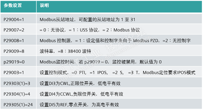 PTI版本V90可以通过MODBUS RTU通信实现速度控制,首先根据下表3-1设置好对应的参数: