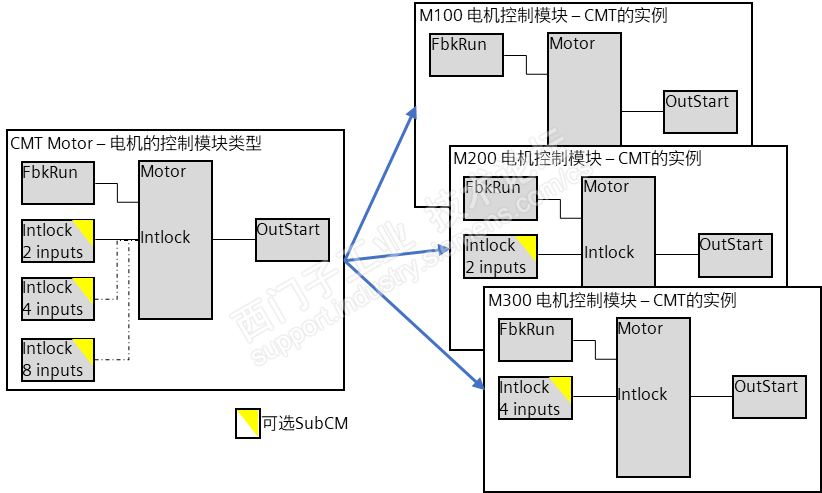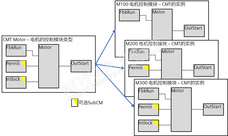以电动机控制模板为例,在实际编程过程中可能会有如下需求:有的电动机可能不包含任何外部连锁;有的可能需要启动允许;有的则需要启动允许和不带复位的互锁。在CMT之前可能没有太好的方式实现此功能,只能每种情况对应一个过程标签类型,甚至没有使用类型每个电动机都是一个 CFC。