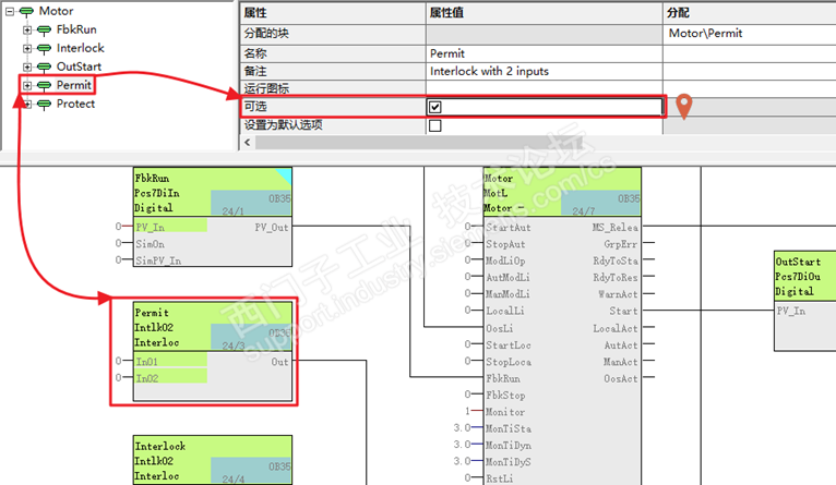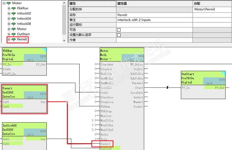 在 PCS 7 侧的实际组态步骤为:初始情况下 CMT 和 CM 均未添加 Permit 管脚互连的 Interlock 功能块。