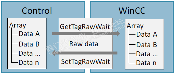 应用中介绍了如何将大量数据从 PLC 传输到 WinCC。原始数据(Raw Data) ?于将大量数据从 PLC 传输到 WinCC 或从 WinCC 传输到 PLC。如下图所示: