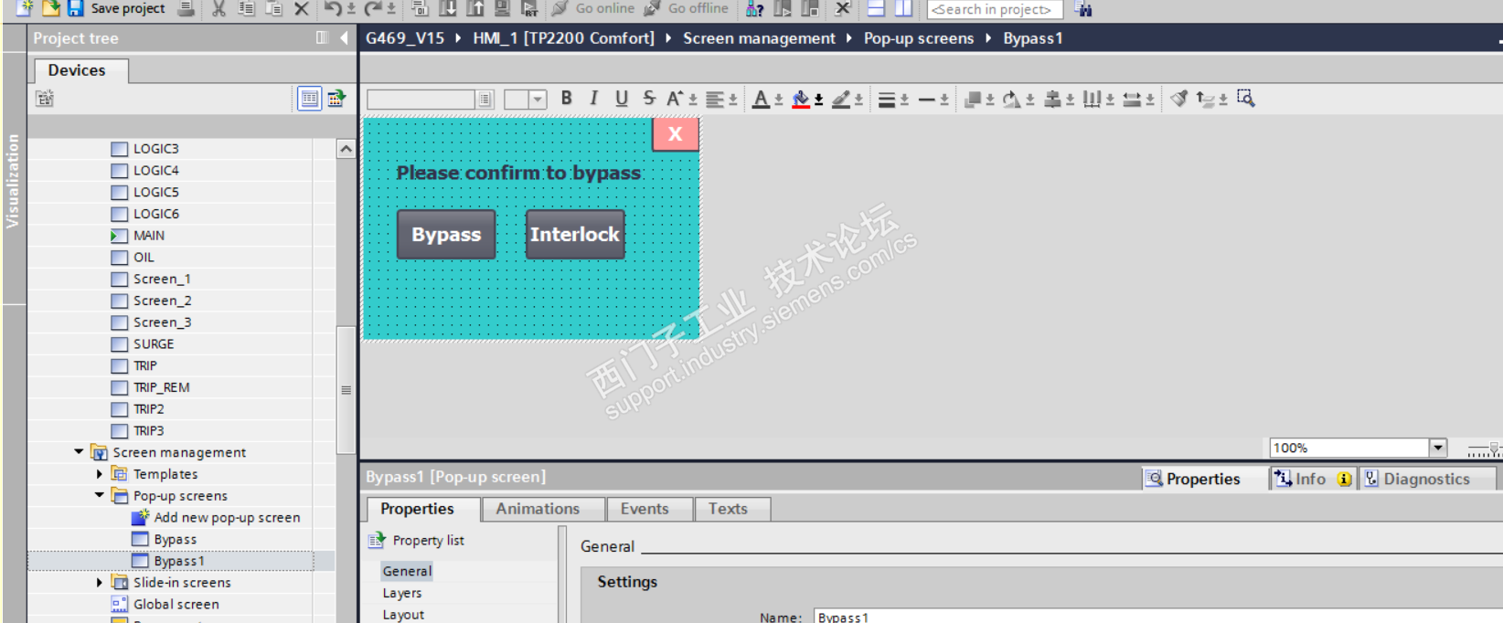 1). 在 HMI 画面管理下的弹出画面中添加新的弹出画面命名为“Bypass1”,调整