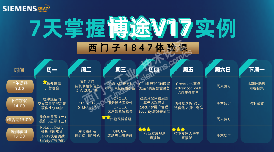 目前《走进博途V17》为付费专题,为了让更多的工程师掌握博途V17,我们选取了该专题中最有含金量的视频,配合专家答疑、直播、助教指导等教学服务,开设了《7天掌握博途V17实例》体验课,限时免费报名!!