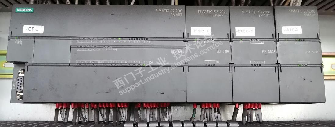 记得那是我刚来目前这个单位来工作,第一天上班就接到领导安排的一个任务,说是8输煤皮带的干雾抑尘装置不能正常使用,让我过去看看,当时我心想我,这是领导在考察我的工作能力,自己一定要给领导留下一个好的印象,怀着这样的初心就到现场,一看就地的控制柜是通过西门子200SMARTplc来控制的电磁阀动作,大体的粗略的扫视了一下柜子里的设备,心里觉得还行,设备部不是太多,是一块cpu,带三块模块,两块数字量输出,一块模拟量输入,柜子如下图: