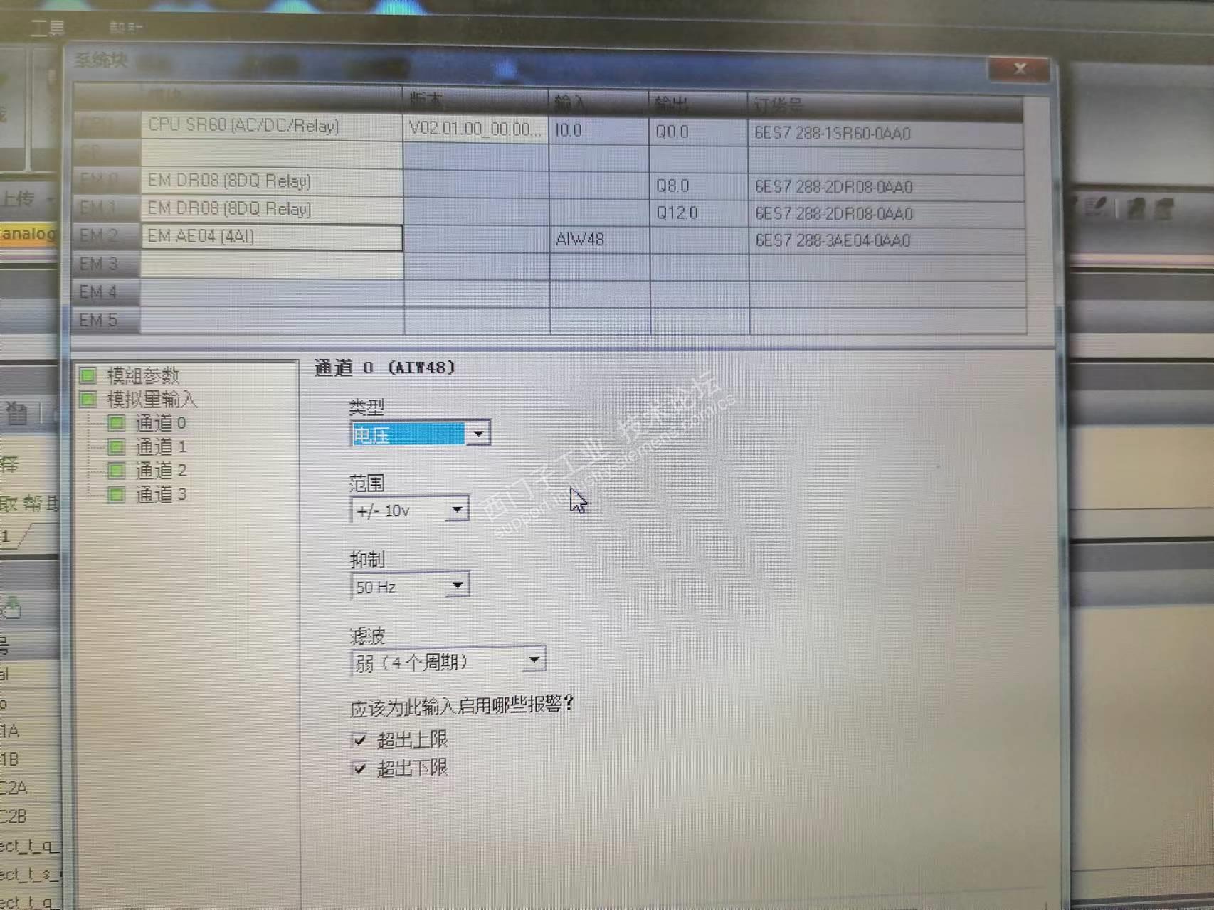 当时的现象就是两个模拟量输入没有信号,刚开始怀疑是不是两个模拟量变送器坏了吗,还是这个模拟量卡件出现了问题,心里自己犯嘀咕,经过自己拿万用表测量,两个变送器都有24v直流电源,能够为变送器提供电源,说明模块正常,再后来用毫安档测量也都有相应的毫安量,这说明变送器也是正常的,那问题出现在哪呢,这可咋办,在没有其他的原因了,领导那还等着回话呢,一时间我也没辙了,最后看看程序吧,正好我的笔记本有那个200smart的软件,那时班组里边的笔记本确实是没有软件的,所以我感觉我还是比较靠前的,特别是我连到plc的程序时,我的同事对我刮目相看,觉得我在plc这方面还可以,带着这种优越感,我也硬着头皮打开程序,刚开始也是在乱看,没有目的性,就是随便的翻看,突然间就看到了模块的设置,如下图