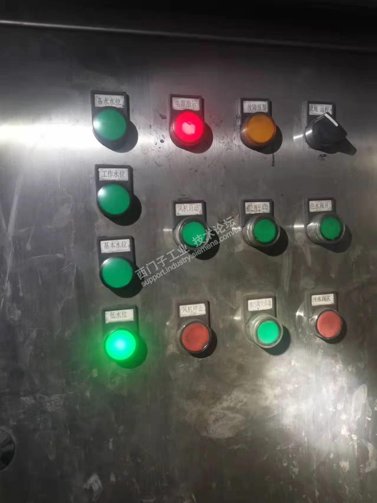 我厂的输煤系统用了一个管式除尘设备,其工作原理就是通过风机抽吸将带有煤粉颗粒的气体,然后通过特定的通道将煤粉颗粒留下,然后用水将煤粉颗粒冲刷带走,它有四个水位指示灯,其控制柜如下图: