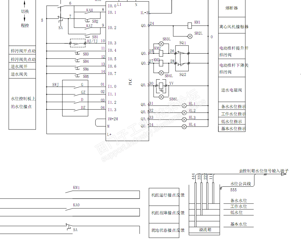 那天故障情况是,四个水位灯同时亮,同时灭,导致输煤操作人员说是plc失控了,当时我到就地一看,确实是操作人员说的,稍微的动一下四个水位计的接线,要么灯全灭,要么灯全亮,因为四个水位计的出现接线在一块绑着,它们的公共线是接着其外壳的,此时我心想,这绝对不会是plc出现问题了,因为plc控制的输出,如果坏了,就不会出现这种变化了,当然不会和外部的操作有关,况且当时就地这几根线的工作环境比较潮湿,外部都有水,线和线有可能短路,水位计出来的线不是整根,而是做了四个接头,然后连到plc是输入,说实话我从原理图上没有看出来,怎么才能导致出现这种情况,四个灯,同时亮起,同时熄灭的情形,当时我把四个水位计的线,都拆开,并且把水都擦干净,重新接上,灯的指示正常了,光是低水位的灯亮了,虽然缺陷是消除了,但是没有把问题彻底搞明白,心里不甘心,这件事过去好长时间了,但是我还是没有想通,希望大家,积极参与,积极留言,谢谢!