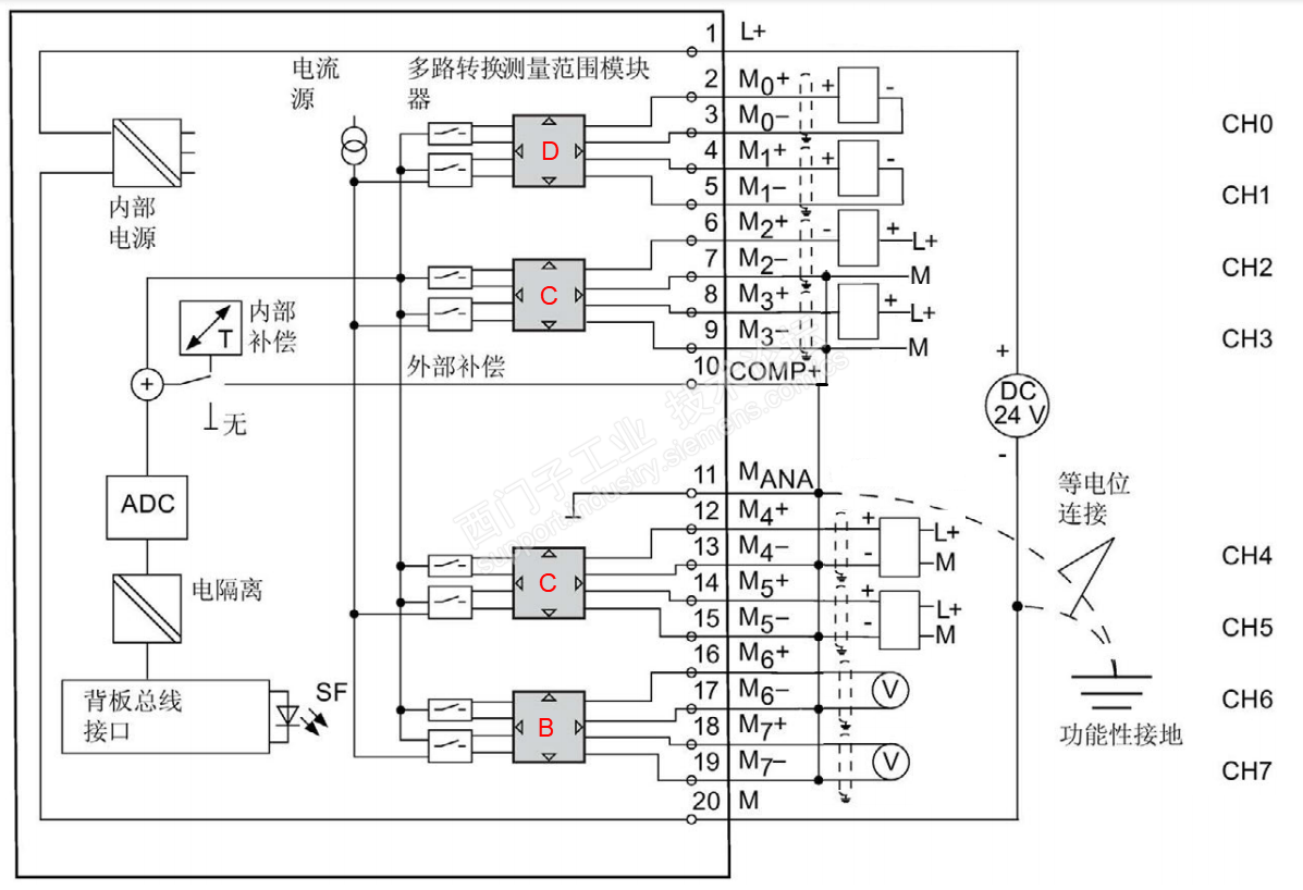 一般自控厂家在设计PLC柜图纸的时候都比较注意模拟量输入通道等电位连接的重要性,通常每个输入通道的信号负极都与等电位点连接并且同时与模块24V负端连接,保证信号免受共模电压干扰。但是工厂自主运维的时候增加模拟量输入模块时常常忽略等电位连接,从而引发了不少故障问题。