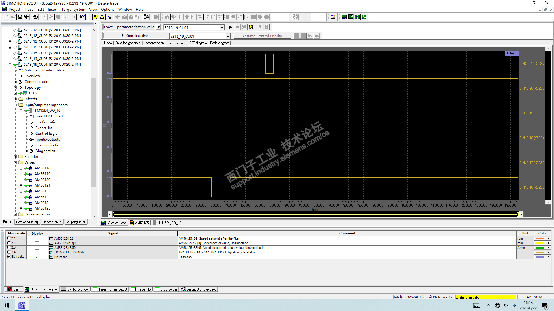 HMI画面合闸后,逆变器零速运行,抱闸打开命令(r899.12)通过TM15端子模块输出给01K13-01K18直流24V继电器,01K13-01K18继电器常开点控制01KM13-01KM18抱闸接触器吸合,现场电机抱闸打开,设备运行;HMI画面分闸后,逆变器停止运行,抱闸关闭命令通过TM15端子模块输出给01K13-01K18直流24V继电器,01K13-01K18继电器常开点控制01KM13-01KM18抱闸接触器断开,现场电机抱闸关闭,设备停止运行;