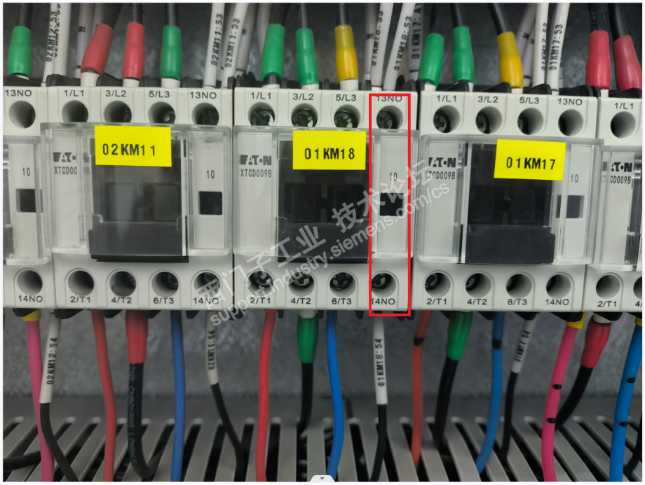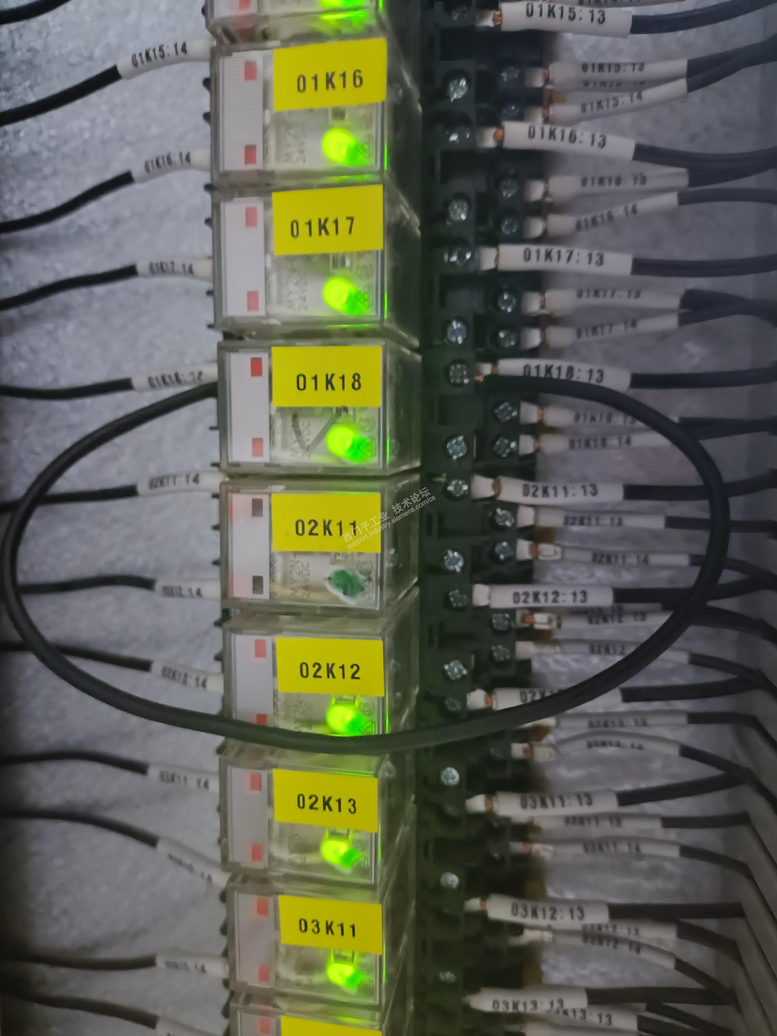 将01K18对应的中间继电器常开触点13、14短接(逐一排除,将TM15端子模块输出点旁路),情况有所改善(还是由轻微打点);抱闸中间继电器更换为可强制的继电器好些,直接强制继电器即可;