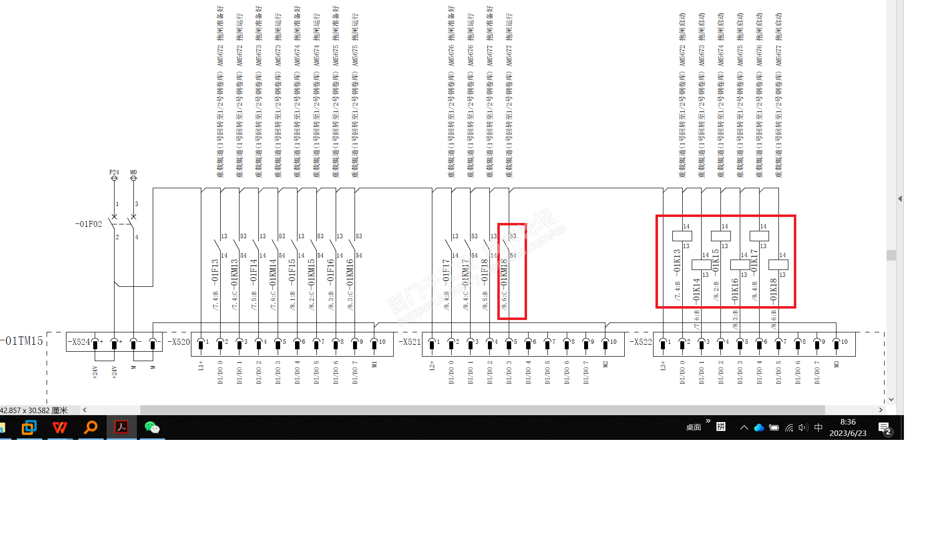 01KM18抱闸反馈点(53、54)与后面X522输出通道电源线短接,当其接触不良时,抱闸输出点电压不稳定,从而导致01K13-01K18中间继电器及抱闸接触器打点;