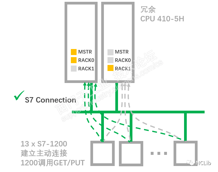 我的一个朋友在TIA Portal中组态了与PCS 7控制器AS 410的28个S7连接(13个S7-1200和一个1500与冗余CPU0和CPU1分别建立S7连接),并在S7-1200与1500程序里调用Get Put功能块对AS410进行读写,所有的S7连接显示与AS410已建立连接。