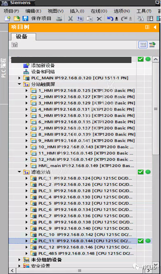 另外还有若干TP1200精致面板都要与CPU 410进行通讯,显示和控制过程对象。TIA博途项目结构如下图