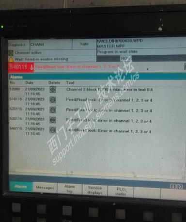 看了看系统报警,应该是属于NCK编程方面的报警。系统明显提示是通道2的N100步这里有标注0.4方面的错误,报警号12080#错误引起的,其它4个5字头的报警信息实际上都是由于12080# 通道2的报警触发的裙带错误,属于同一个报警信息触发的。