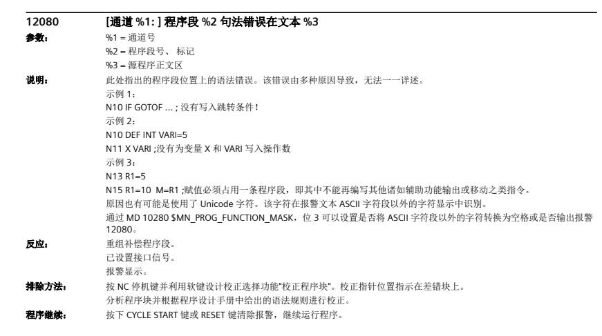 打开西门子840D诊断手册,查阅12080#错误的含义,图示: