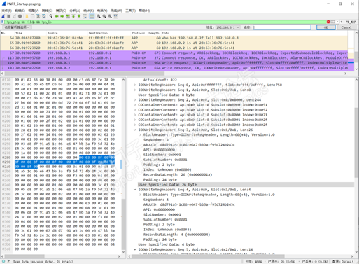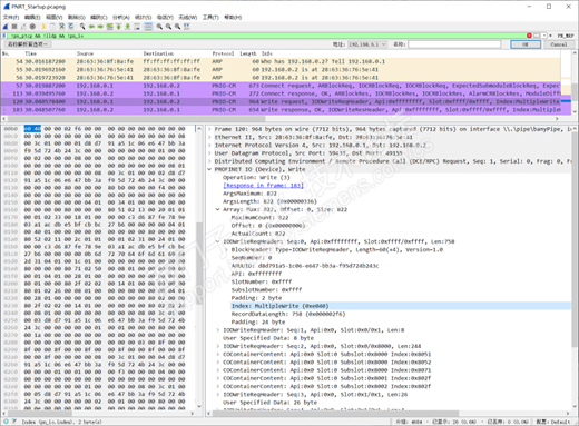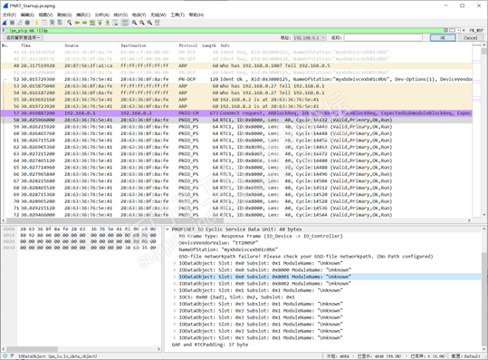 在“Connect.req”成功后,设备中的循环状态机启动,这是因为利用其监视通信关系。这意味着即使系统启动仍未完成,不过IO设备“28:63:36:76:5e:41”已经开始向控制器“28:63:36:8f:8a:fe”传递过程数据(从序号58开始)。当Connect.res,则控制器开始向IO设备发送循环IO数据。然而,各个子槽的没有通过Wirte帧被参数化,所以模块名称为“Unknown”,实时通信的协议标记为PNIO_PS(Problem Status),表示实时通信尚未建立。