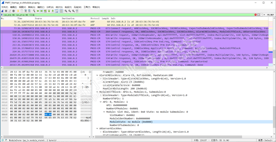 如果在“Connect.req”(序号73)期间发生错误,例如,期望的子模块在设备中不存在(拔去2号槽的DO模块),则设备将该状态放在随后的“Connect.res”中(序号110)。使用Bany重新捕捉此情形下的系统启动报文,报文中的“ModuleDiffBlock”提示“Slot 0x2”不存在“no module”。