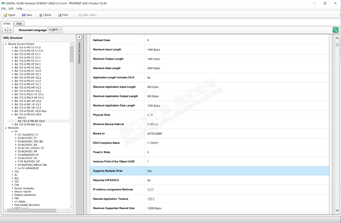 控制器随后使用“Write帧”来参数化已组态的子模块,对组态子槽所对应的各子模块进行参数化。控制器可以分别写入各个Subslot,或者如果接口模块支持多重写(GSD文件中Supports Multiple Write=Yes),则同时一次多重写入“”MultipleWrite“多个模块。报文中表示ET200SP的接口模块支持多重写,与GSD文件的参数所对应。