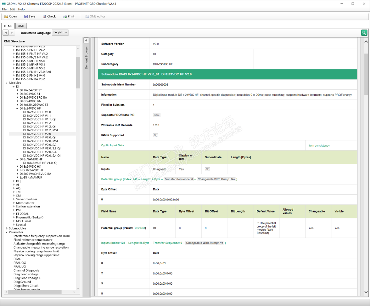 上述DI 8x24VDC模块的“Inputs”这些参数对应GSD文件中的Inputs (Index:128 – Length:26 Byte),具体参数配置长度为26bytes,前(第0和第1个字节)两个字节0x00,0x03为固定值,从偏移的第2个字节之后的3个字节表示通道Channel 0的参数,一个通道参数占用3个字节,那么这8个通道的参数占用24(26-2)字节。Wireshark报文中的通道0的3个字节参数设置为00 8f 00,在GSD文件中这三个字节的偏移的Bit的数值即对应了硬件组态的参数设置,例如:Channel 0 activated的偏移地址3.7的数值为1,即第三个字节(10001111)最高位为1表示Channel 0通道激活,与上面的8DI模块硬件组态的Channel 0配置一致。