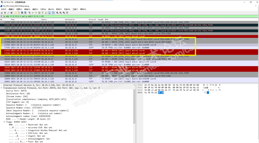 这里稍稍描述一下这一段TCP报文的含义,抛开这个异常出现的报文842从哪里来的问题,首先,正常关闭TCP连接4次挥手并不是唯一的选择,RST也是关闭连接的一种方法,例如,如果主机认为对方或端口不可达,就会使用RST尽快关闭此连接。通常情况下使用RST报文,因为RST不是TCP通信连接的一部分。在842使用的RST, ACK报文是在3次握手连接中带ACK确认标志。接着是843号报文,该报文的长度是60个字节,与MES侧的17591号报文对应,因为MES侧是在本机抓包,出口的报文54会被填充最小长度的以太网报文,于是在843出现了60个字节的长度应答。TCP Acked unseen segment表示客户端10.61.3.110通知S7服务器10.18.61.8有数据包丢失,因为我们知道Ack号等于上一个TCP报文(服务器à客户端)中顺序号+Len,而在843号报文中的Ack=33554433,明显不知道应该如何计算出来的,这表明服务器发送的数据包有丢失的,可是网络状况十分良好,不会存在拥堵的情况,这说明这是一个来自客户端异常的报文。于是3次握手无法成功,导致连接无法建立,所以也就无法进行通信。