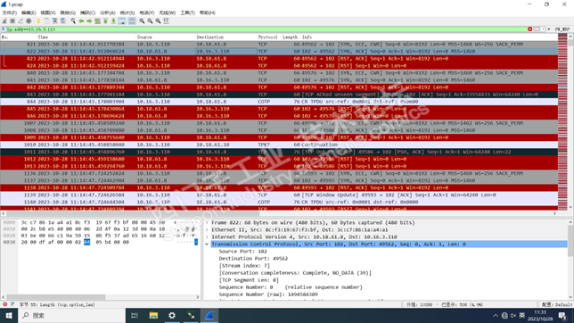 这时我们在来查看来自CPU侧的报文,找到端口号Port:49576来自MES的报文,在序号840处。这里看到S7客户端(MES)通过端口号Port:49576和1500CPU做了TCP的2次握手(840,841)这与MES侧相同,下面问题发生了,S7服务器竟然收到了来自S7客户端的RST请求,即序号842,然而这个报文没有在MES侧的报文中出现,那么这个报文是哪里来的?意不意外?但是从Seq和Ack号来看这个报文的就是MES侧17591,问题是17591经过了路由为什么会从Ack变为RST,Ack?