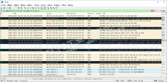 基于这样的疑问,使用!ip.addr==10.16.3.110 && !ip.addr==10.18.61.8过滤规则,查看其它的不属于该终端的IP地址,发现了有些不属于该终端的一些报文,黑色标识。特殊的是10.18.63.8这个IP地址并不存在于现场的设备中,但是报文中的MAC地址与192.168.61.8的MAC地址也相同。还有一个需要注意的是2996号报文,实际上0网段的IP地址出现在集成的CPU上,可能是现场的接线有连接CP卡的地方,但是单播的IP报文通过交换机是怎么到达在10.18.63.8的CPU侧的呢?两者(192.168.0.219/192.168.0.203)的MAC地址与此CPU并不相同。