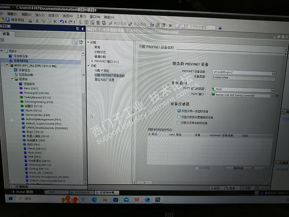 17:10接到协助电话,赶赴现场,细致排查外围及电柜表象后,发现总控西门子1511PLC及二工位夹具侧EX600阀岛组的多个红灯闪烁不停。遂连接外设电脑,在线搜索整条产线的组态元件时,没有看到二工位夹具的EX600阀岛组。抢修临时小组依次对调了工位一二的阀岛组网线、电源模块、通信模块、输入模块后,将故障点定格为输入模块坏掉。抢修临时小组来不及喘息,立即更换故障件,恢复好先前线路,在电脑侧通过博图软件识别出更换的阀岛组并进行MAC地址识别后,写入总控PLC内。至此,PLC及EX600上闪烁的红灯全部熄灭,正常状态的绿灯全部点亮。操作人员试运行设备,夹紧、旋转、焊接等动作均正常。抢修完工后,小组进行了修复过程回顾,记录了排故过程,总结了此类故障的大致处理技巧,为后续其他设备的运维积累了实战经验。