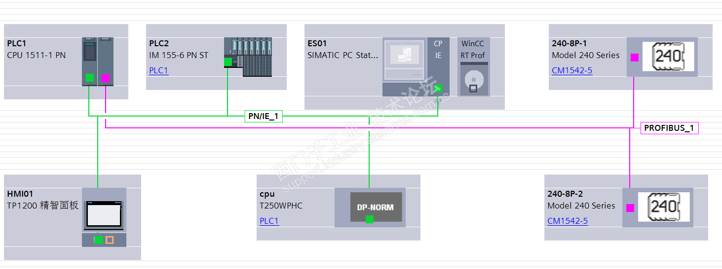 项目概况:本系统主要由S7-1500作为主站,一个TP1200精致屏,一个远程IO站(ET200SP),一个S7-1200作为智能从站,和1500PLC走Profinet通讯,主要控制压缩机。网络结构如图所示: