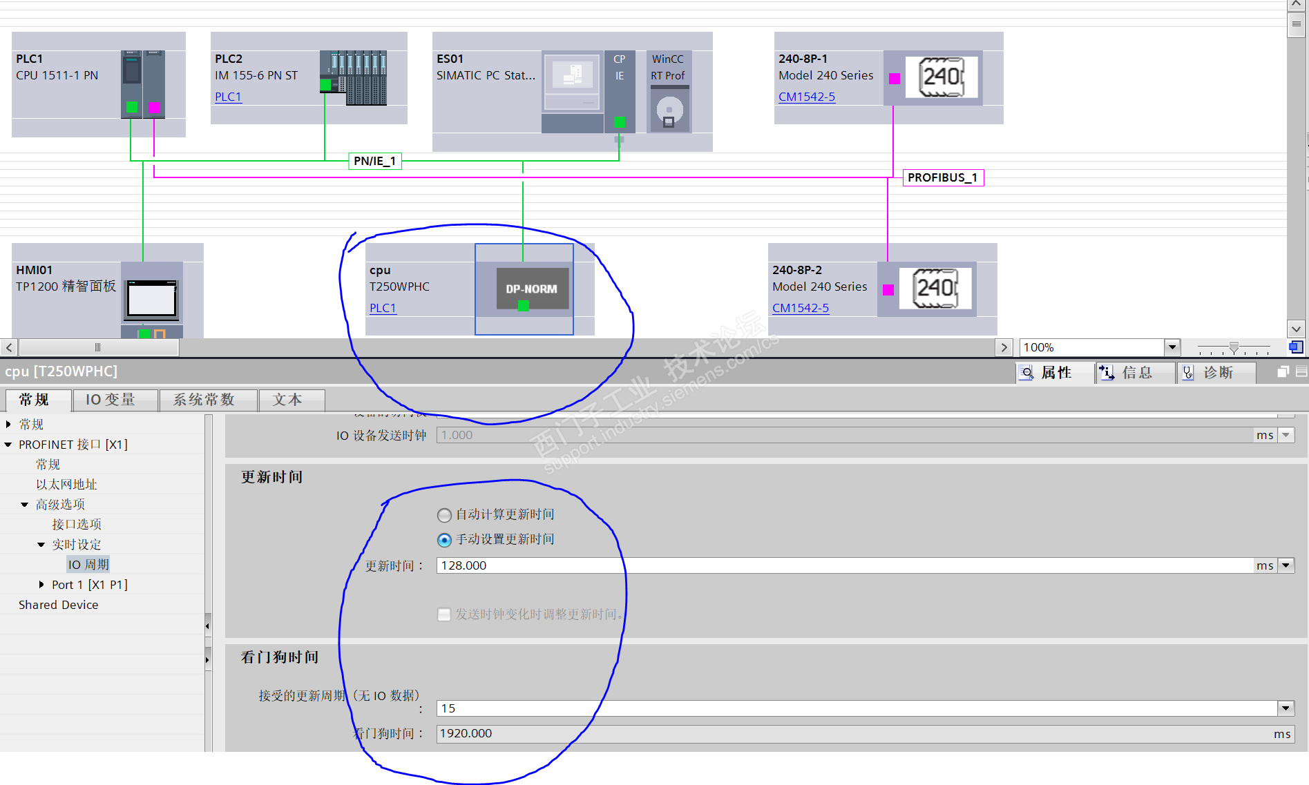 后续问题排查及解决方案:此套系统的运行对客户很重要,为后续其他系统运行提供保障。客户提出组环网保证系统平稳运行,环网交换机没有组态到博图中,通过网页配置。系统中的所有网线和水晶头全部换成西门子的,整个系统中S7-1500作为管理器,2个管理型交换机和远程站作为客户机。整个更换完成后,测试网络冗余,通过在线诊断发现压缩机还是会出现掉站的情况,持续时间大约3S后恢复,于是又检查了网线和水晶头,交换机的配置,发现没啥问题,然后检查周围也没啥设备干扰系统,陷入僵局后各种网络查询找类似的问题解决方案,后续调整看门狗事件和更新时间,问题还是没解决,图为系统默认看门狗时间设置: