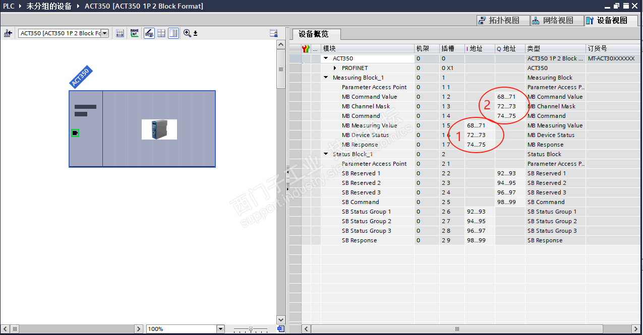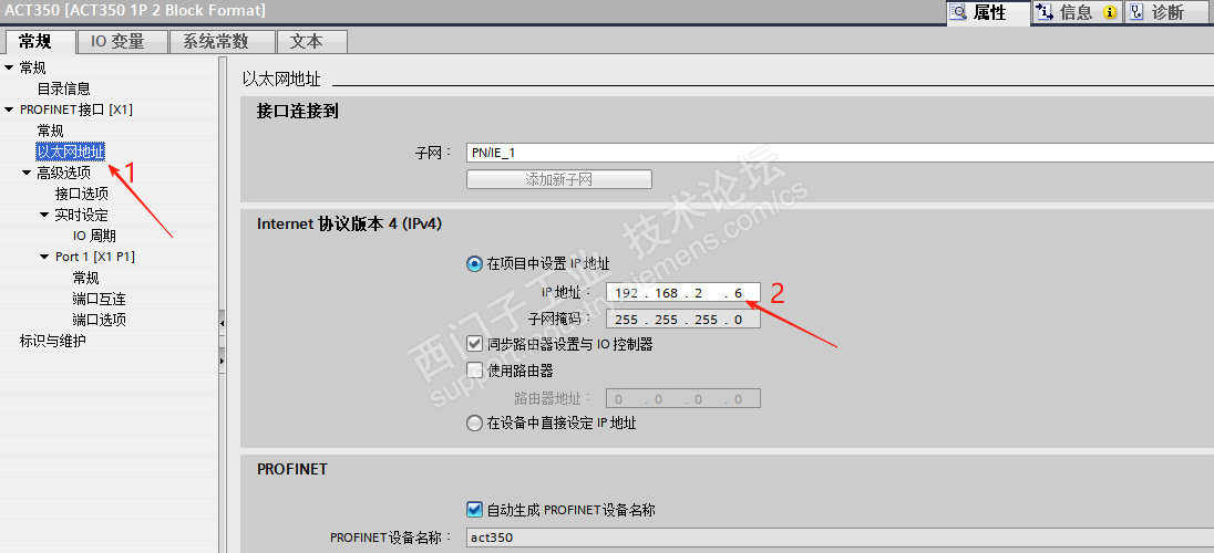 图1-2为PLCIP地址为192.168.2.1,所以所有子设备的网段都配置成在网段2上但不同地址如此ACT350IP地址为192.168.2.6
