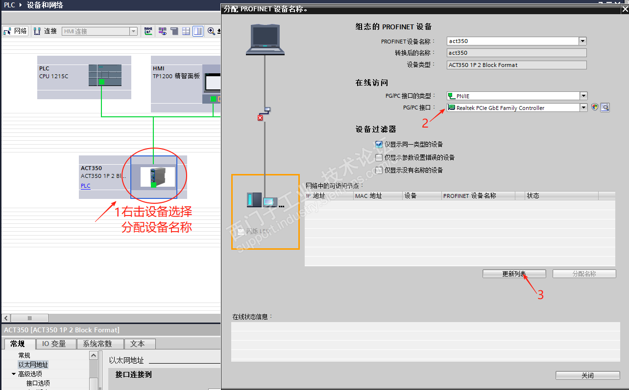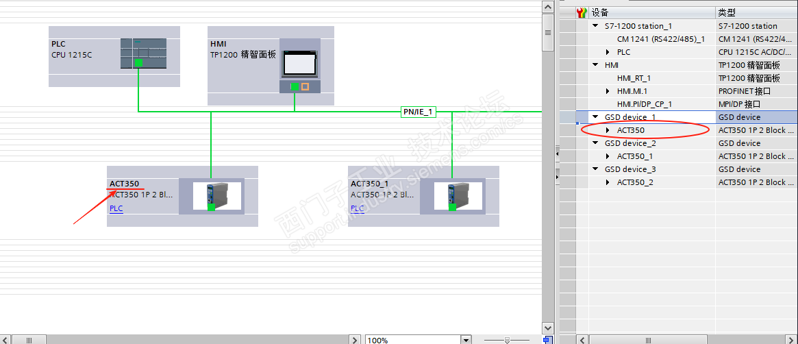 安装号后即可从硬件目录中(图1-1)选择并拖拽到网络视图中并进行PN连接配置
