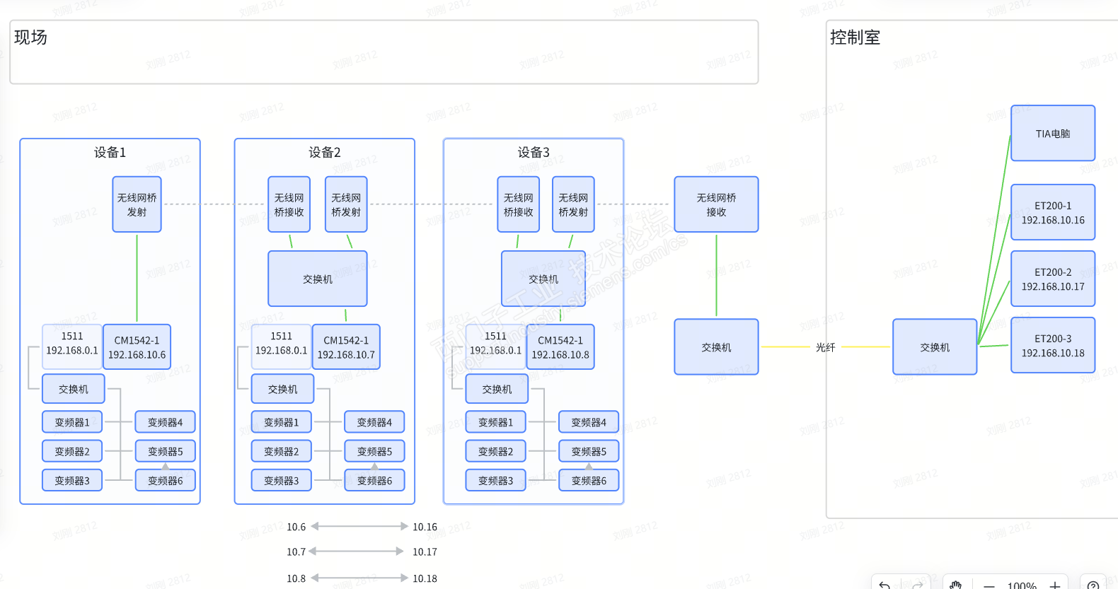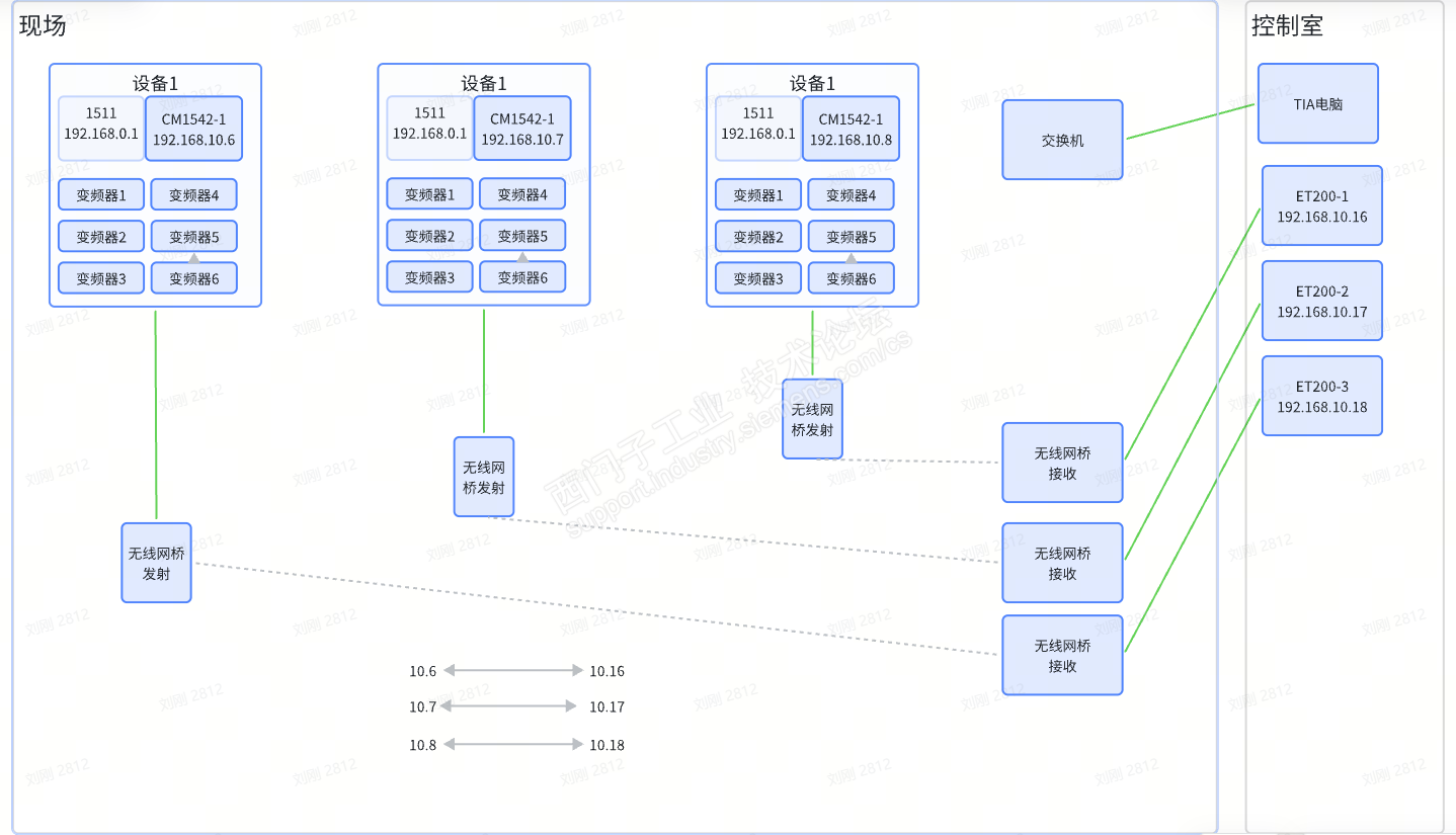 考虑到现场设备以前都是单机的,PLC、变频器等设备的IP网段都是0网段的,且设备中的PN名称都是一样的,例如设备1的PLC的PN名称为PLC,IP为192.168.0.1,变频器名称分别为变频器1、2、3,IP为192.168.0.10、11、12,设备2的PLC名称为PLC,变频器名称也分别是变频器1、2、3,IP地址为192.168.0.10、11、12,在对原始配置不大变动的情况下,对三台设备分别新增远程IO,三个网络互相独立,因现场设备是可以大范围移动的设备,采用光纤或网线的方式比较麻烦,所以选用无线网络进行互联。